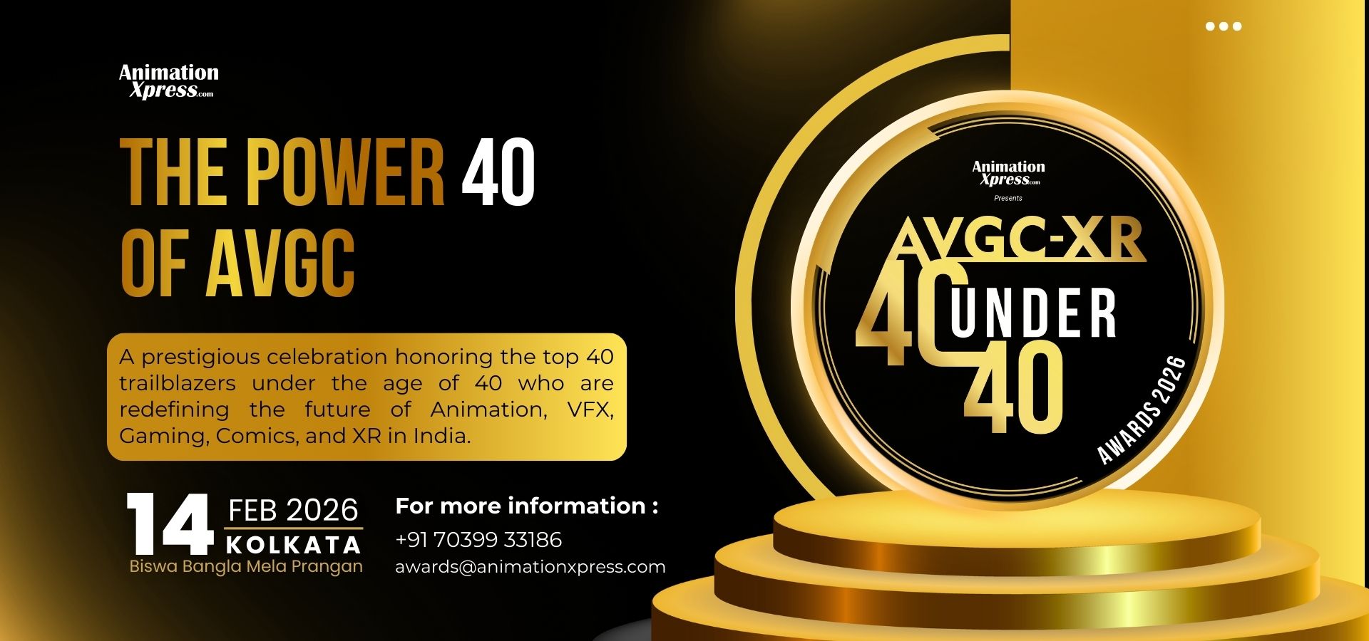 The AVGC-XR 40 UNDER 40 Awards is an annual initiative dedicated to recognizing exceptional talent under the age of 40 who are transforming the Animation, VFX, Gaming, and Comics (AVGC-XR) industries.